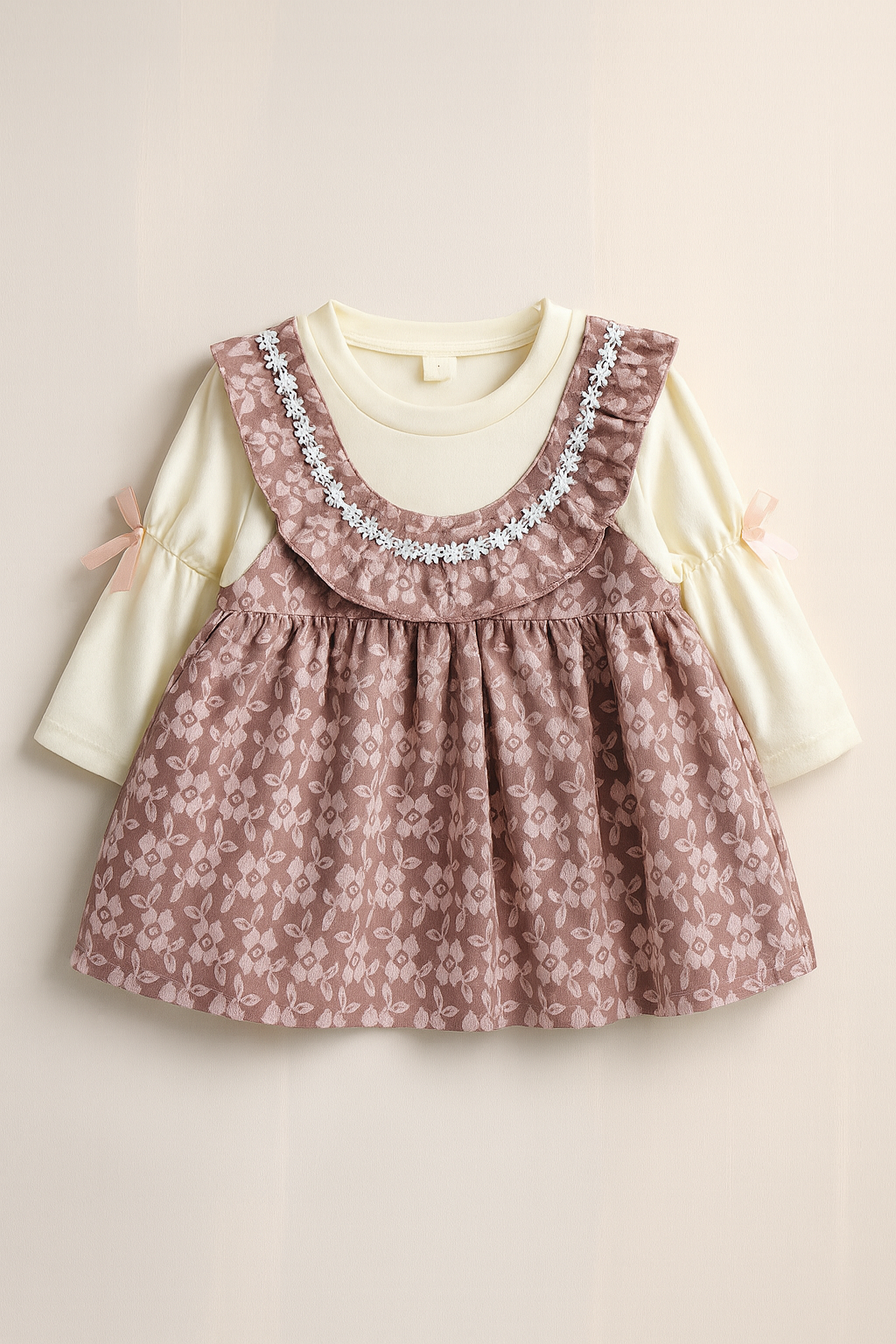 This adorable layered baby dress set features a creamy long-sleeve knit top paired with a soft, dusty-rose floral pinafore dress. The outer dress showcases a delicate allover leaf-and-flower pattern, complete with a charming ruffled bib trimmed with dainty white lace flowers. Sweet satin bows accent the sleeves for an extra touch of femininity. Designed for comfort and elegance, this two-piece outfit is perfect for family gatherings, photos, and everyday dress-up moments.